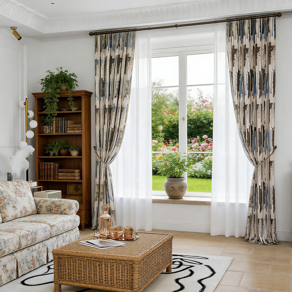 - Accessorize with Solids: Use solid-colored throw pillows and blankets in either the blue or brown from the curtains to pull the whole look together.