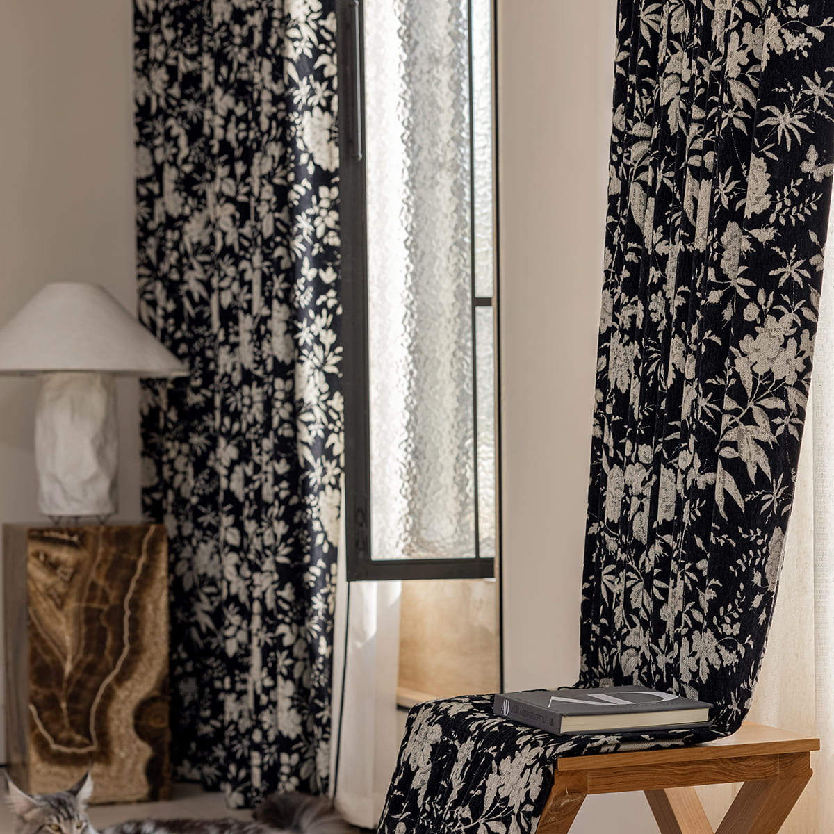 Color: This curtain features a sophisticated black background adorned with delicate white floral prints. The contrast between the black and white creates a timeless and elegant look that can enhance any room's decor.