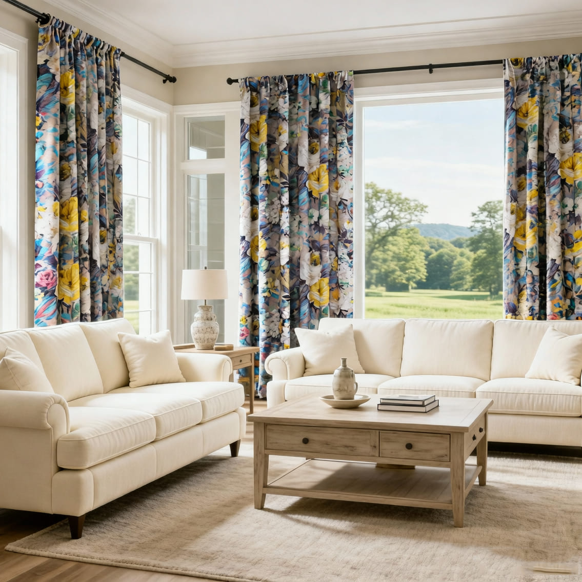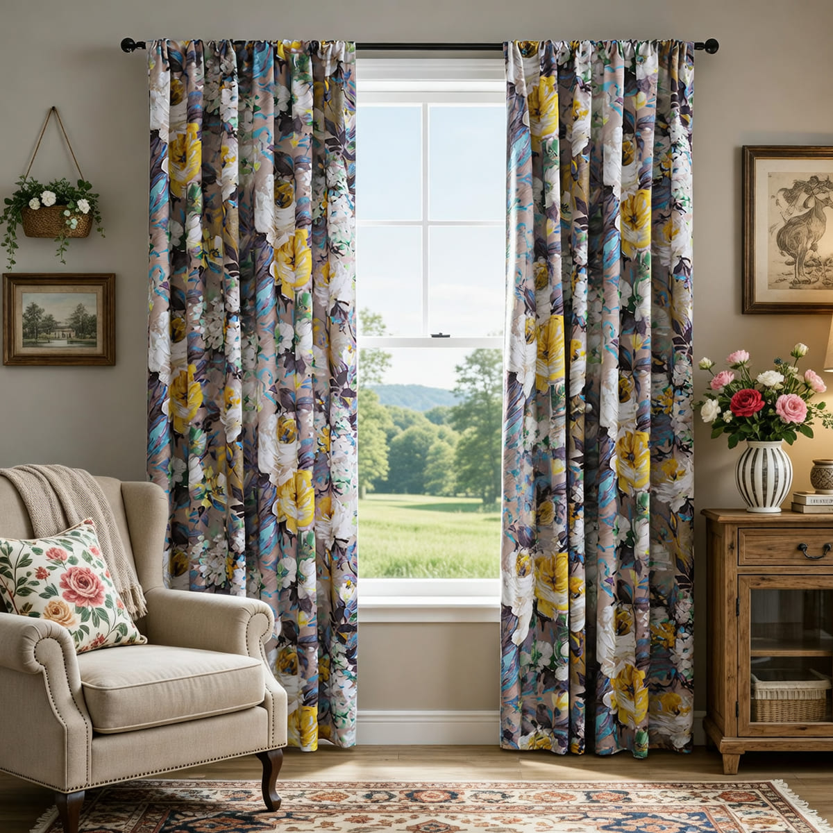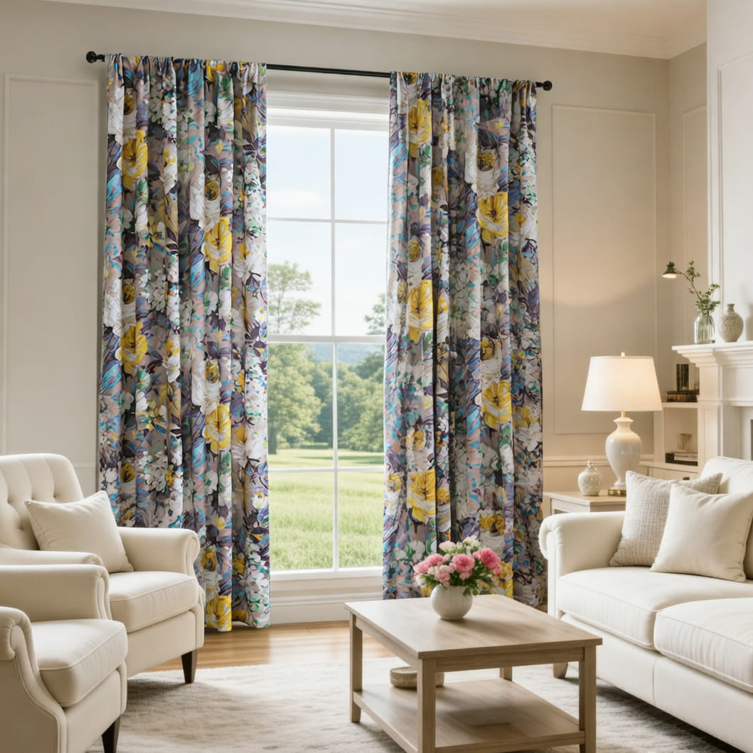 Crafted from a heavy, drapey fabric with a soft beige base, these curtains feature a bold, artistic oil-painting pattern: vibrant yellow peonies, delicate white blooms, and swashes of teal, purple, and green that look like they were brushed onto the fabric by hand. This “wearable art” design taps into the American love for unique, story-driven decor, blending modern luxury with boho-chic warmth.