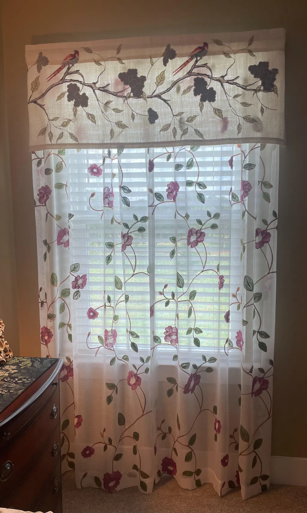 - SHEER CURTAIN FABRIC: 100% Linen Cotton Blend Print, the pattern is pink flower green leaf, the fabric is good quality, looks very elegant and expensive, good stitching and well-made.