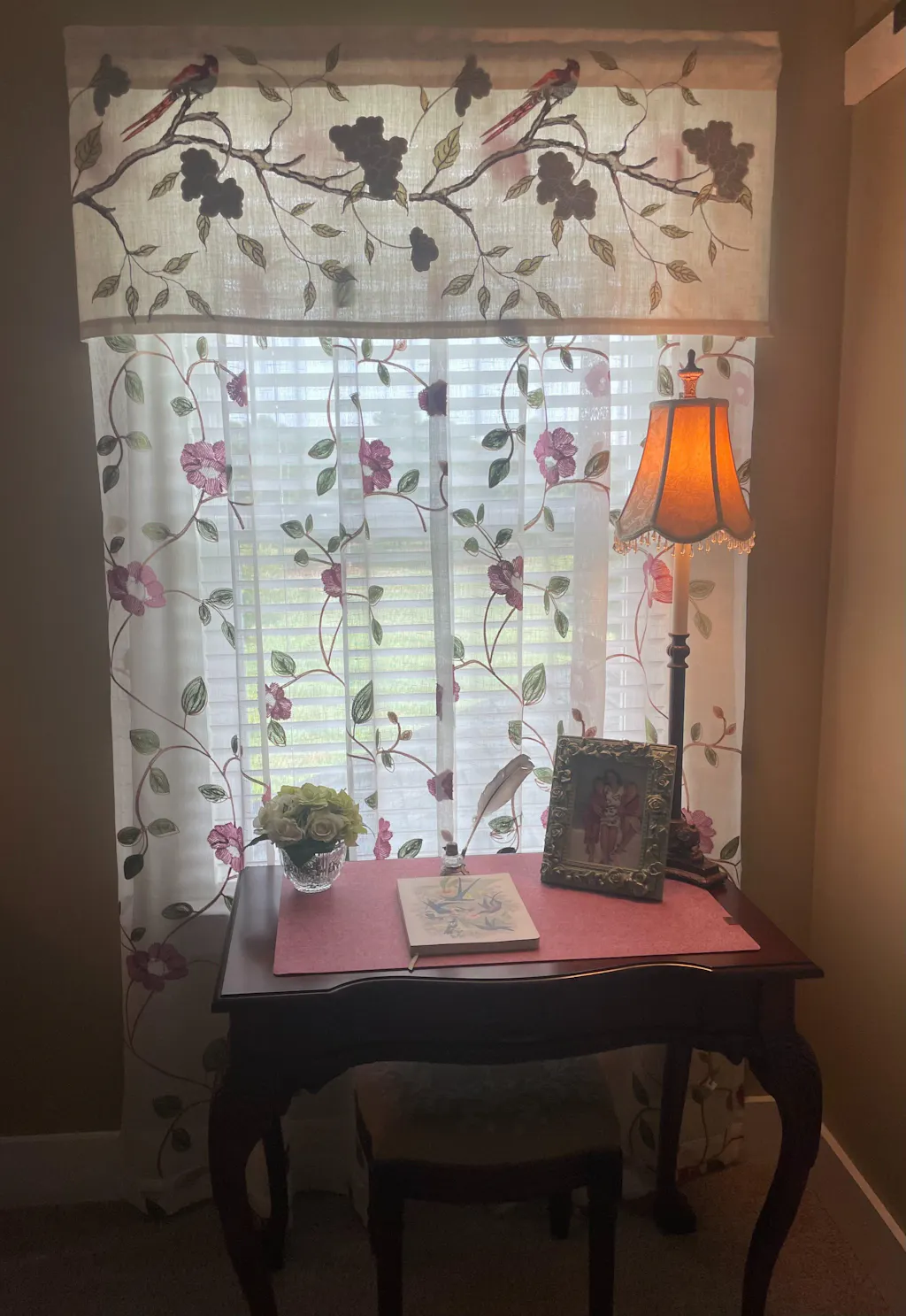 Introducing our white window screen embroidered with pink flowers and green vines and leaves, exquisitely beautiful and naturally graceful. This delicate design brings a pleasant and joyful atmosphere to any room, adding a lively touch of decoration.